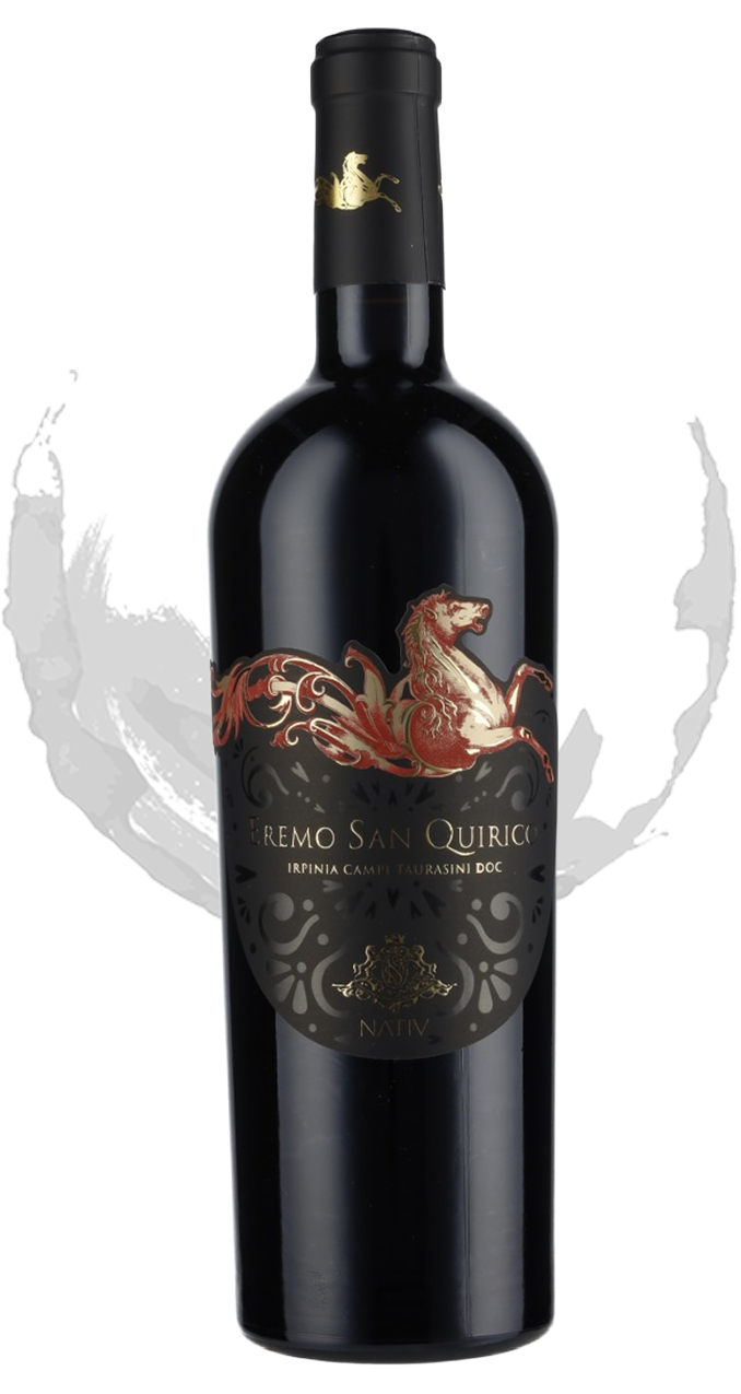 Cultivado em solos vulcânicos nas colinas de Taurasi, este vinho representa uma expressão intensa do terroir. Seu nome faz referência ao antigo eremitério de São Quirico, local histórico onde cavalos selvagens habitavam. A arte do rótulo é assinada pelo pintor contemporâneo Moreno Bondi, conferindo identidade única à garrafa.
